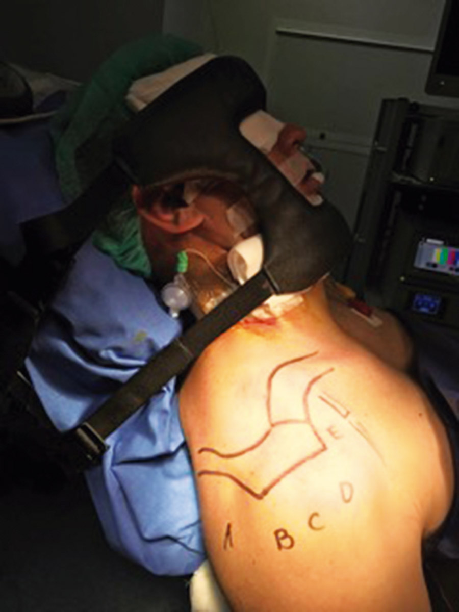 En la cirugía se realizó el bloqueo interescalénico del plexo braquial ecoguiado (Sonosite® Turbo), con ropivacaína 0,75% (10 cc) y mepivacaína 2% (12 cc). Tras confirmar el bloqueo, se indujo, previa monitorización, la anestesia general que se mantuvo con O2-aire, propofol y remifentanilo en perfusión.
