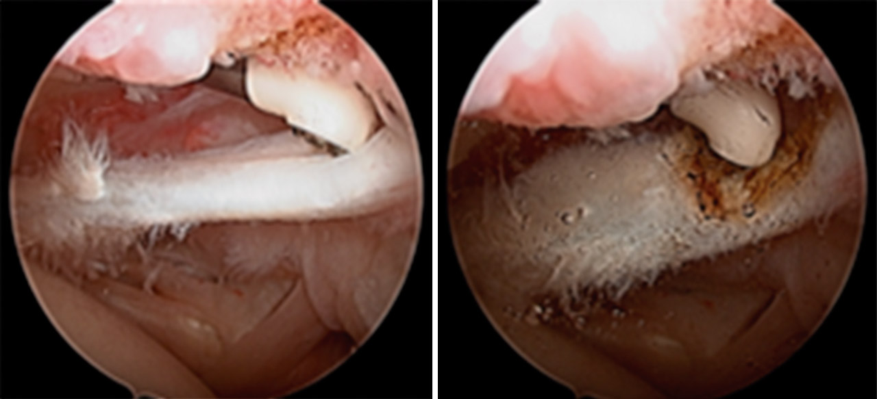 Se inició la artroscopia mediante el portal A habitual (Figura 3) y a través del portal E se confirmó la lesión de SLAP de tipo II con el gancho palpador (Figura 4). Confirmamos la laceración de la porción intraarticular del músculo bíceps braquial (Figura 5). Se realizó el portal D de trabajo para insertar un anclaje y comenzar a realizar la tenodesis de la porción larga del músculo bíceps braquial (PLB). En ese momento, el paciente presentó una grave inestabilidad hemodinámica que obligó a su colocación en decúbito supino y a despertarlo de la anestesia general. En esa posición, se decidió efectuar una tenotomía de la PLB para salvar el procedimiento (Figura 5).