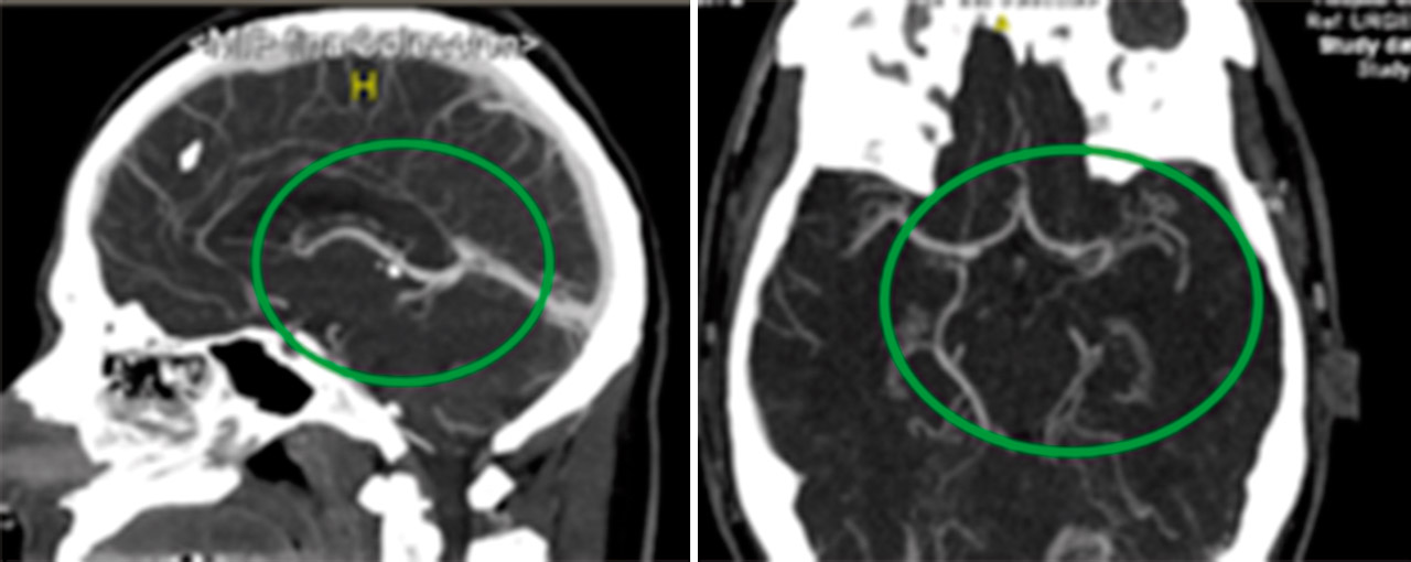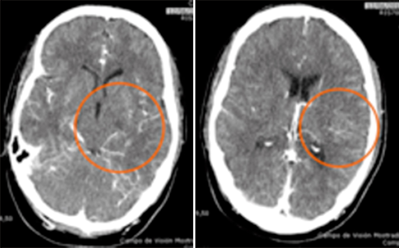 Ingresó en la Unidad de Ictus 5 horas después, donde se efectuaron estudios diagnósticos. En una nueva TC multimodal persistía el defecto de repleción de M1 izquierda y múltiples vasos colaterales; diagnosticándose de síndrome de pseudo-Moyamoya.