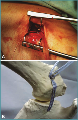 Previous reports have described the use of autograft or allograft augmentation or coracoid transfer in the treatment of this difficult problem. The purpose of this report is to describe a novel technique of arthroscopic, whose is based on the fusion of 2 concepts, one is the effect on the subscapular sling (abduction, external rotation control device), and the other a reinforcement anterior capsular of shoulder, using a synthetic ligament or a tendon allograft. This technique can restore anterior shoulder restraint without excessively constraining the External rotation glenohumeral joint.