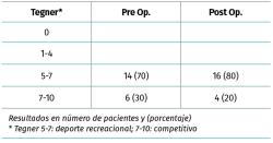 Material y métodos: un total de 20 atletas con reconstrucciones agudas simultáneas de LCA y LCM de grado III fueron tratados entre marzo de 2006 y enero de 2014. El tiempo mínimo de seguimiento fue de 24 meses. Se evaluaron los resultados funcionales subjetivos (International Knee Documentation Committee –IKDC–, Lysholm), rango de movilidad, estabilidad anteromedial y rotacional (Lachmann, pivot shift, estrés valgo). Se registró la capacidad de retorno al deporte (Tegner) y el nivel alcanzado.