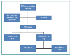 Métodos: se realizó una revisión retrospectiva de las caderas intervenidas desde enero de 2012 hasta junio de 2016, mediante artroscopia de cadera por choque femoroacetabular (CFA) con técnica outside-inside. De los 119 casos totales, excluyendo caderas previamente intervenidas o aquellas intervenidas por otra causa que no fuese CFA, obtuvimos un total de 106 casos para el estudio. Se dispone de radiografías de la cadera intervenida de forma preoperatoria y postoperatoria con un tiempo mínimo de 2 meses desde la intervención. Se ha tomado como referencia la clasificación de Brooker.