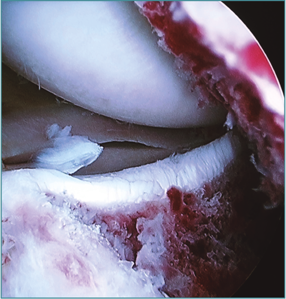 Fractura-avulsión de la eminencia tibial en varón de 14 años. Imagen obtenida durante la exploración artroscópica inicial, en la que se observa compartimento interno sin alteraciones y fragmento óseo avulsionado a nivel de las espinas tibiales.