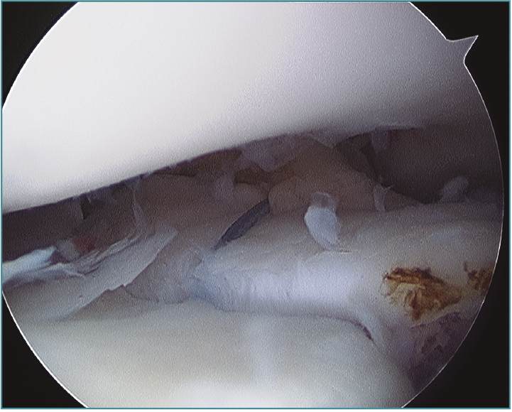 Fractura-avulsión de la eminencia tibial en varón de 14 años. La imagen muestra la visión final de la reparación artroscópica mediante la técnica de sutura en 4 puntos.