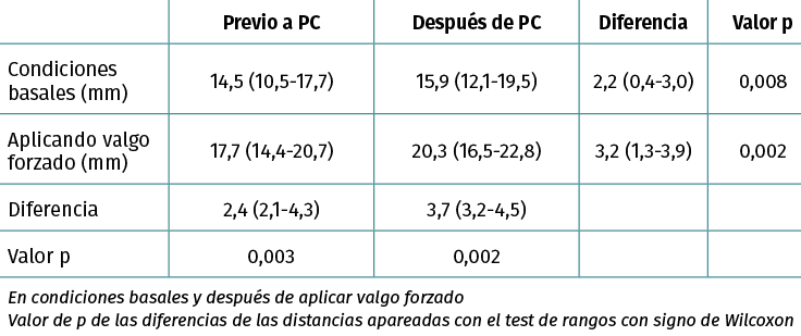Results: prior to the PC technique, the mean (SD) distance between femur and tibia in the medial compartment was 14.2 (4.0) mm in basal conditions and 17.1 (3.7) mm when applying valgus force (p = 0.003). PC technique increased the mean (SD) distance in 1.9 (1.9) mm under basal conditions (p < 0.01) and 2.9 (1.6) mm when applying valgus force (p < 0.01).