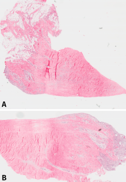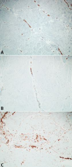 Resultados: no se detectaron vasos linfáticos con D2.40. Los vasos se detectaron mediante FcVIII, CD31 y CD34. Estos vasos se encontraron en la región denominada roja. Sin embargo, encontramos CD34 (sugestivos de células progenitoras endoteliales) más allá de la región vascularizada. La microscopía electrónica demostró que las fibras de colágeno seguían un nivel de densidad, empaquetamiento y rangos de diámetro normales.
