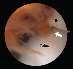 El pinzamiento óseo anterior del tobillo es un síndrome caracterizado por dolor, causado por la inflamación del tejido blando, que queda comprimido entre los osteofitos del astrágalo y la tibia durante las fuerzas de flexión dorsal. La artroscopia del tobillo proporciona resultados buenos a excelentes con pocas complicaciones en este tipo de procesos. En la exploración, se puede provocar dolor por palpación sobre la interlínea articular anteromedial y/o anterolateral. Es necesario realizar una planificación preoperatoria adecuada, basada en las radiografías estándar (anteroposterior, lateral y oblicua) y la resonancia magnética, en orden de identificar y localizar los osteofitos para realizar una correcta y completa resección de estos, lo que proporcionará el mejor resultado posible.