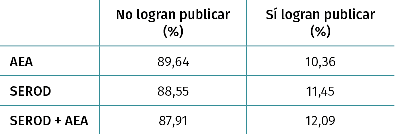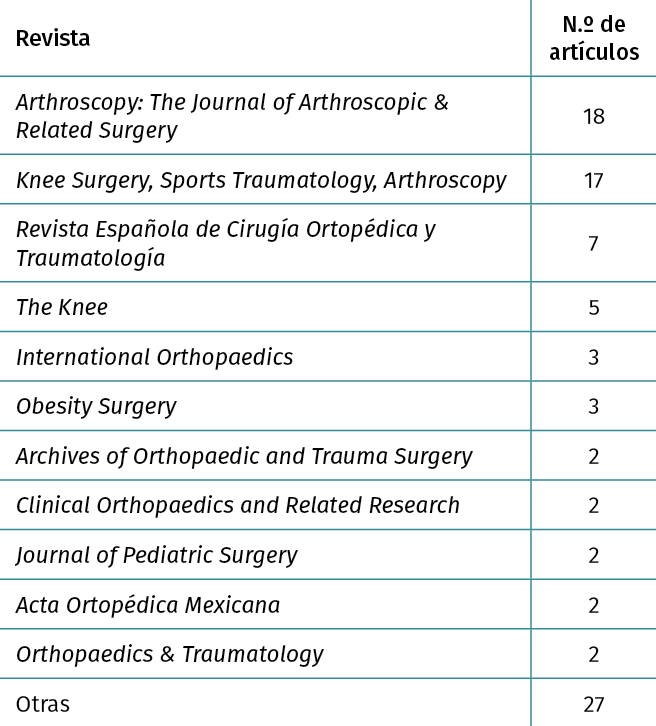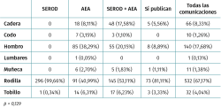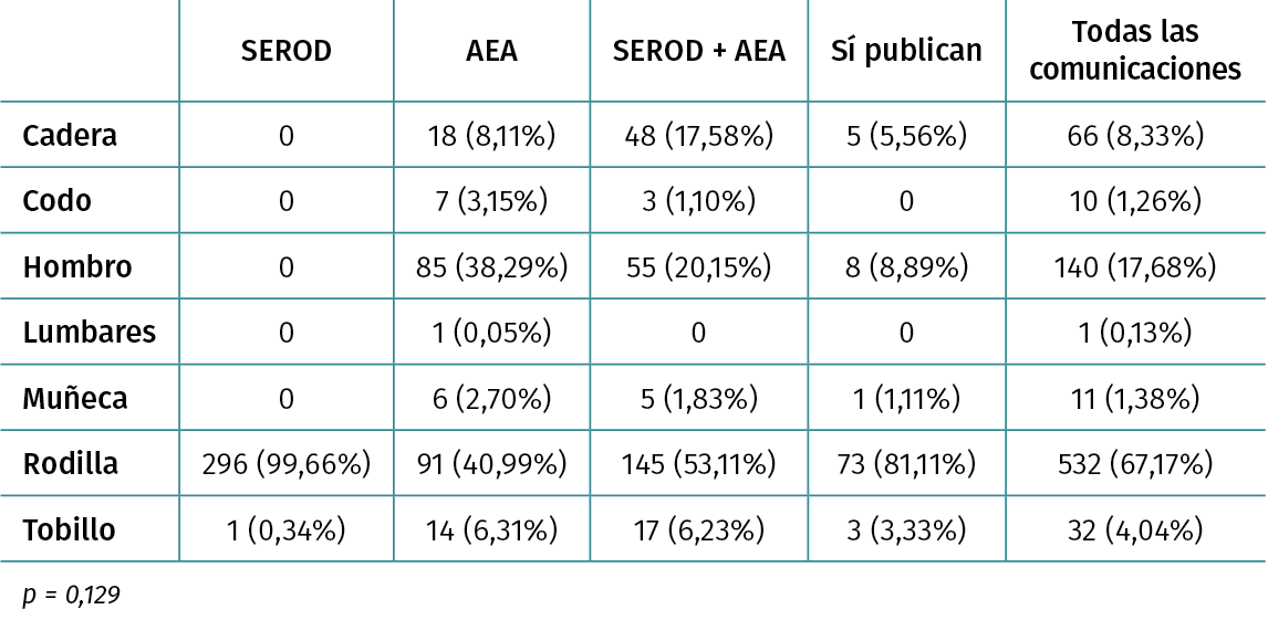 Resultados: existe una diferencia no estadísticamente significativa entre la ratio de publicación de cada congreso (AEA = 10,36%; SEROD = 11,45%; SEROD + AEA = 12,09%; p > 0,05). Existe también una diferencia no estadísticamente significativa entre el valor de la población estudiada (n) y la ratio de publicación (n media de SÍ = 156,5379; n media de NO = 108,99; p = 0,150). Informar del valor de la población a estudio respecto a NO, presenta ratios de publicaciones distintos estadísticamente significativos (SÍ informa y SÍ publica: 12,62%; NO informa y SÍ publica: 1,15%; p = 0,0027). El porcentaje de provincias de origen de las comunicaciones orales demuestra que en todos los casos la presencia de Barcelona + Madrid es entre un 53,11 y un 55,22%. La presencia de Barcelona + Madrid en aquellas comunicaciones que logran publicarse es del 80,09%. Comunicaciones de rodilla presentan mayor porcentaje de publicaciones. Las revistas más frecuentes de publicación son Arthroscopy y Knee Surgery, Sports Traumatology, Arthroscopy.