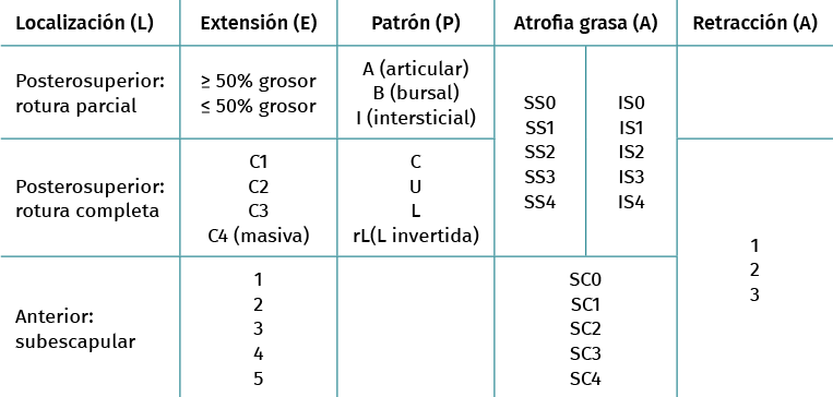 Se han descrito muchas clasificaciones del manguito rotador; sin embargo, no existe ninguna que englobe todos los criterios que permitan un diagnóstico y un tratamiento óptimos. Estas clasificaciones deben describir la localización y la forma de la rotura, y tienen que ser reproducibles y validadas por médicos e investigadores.