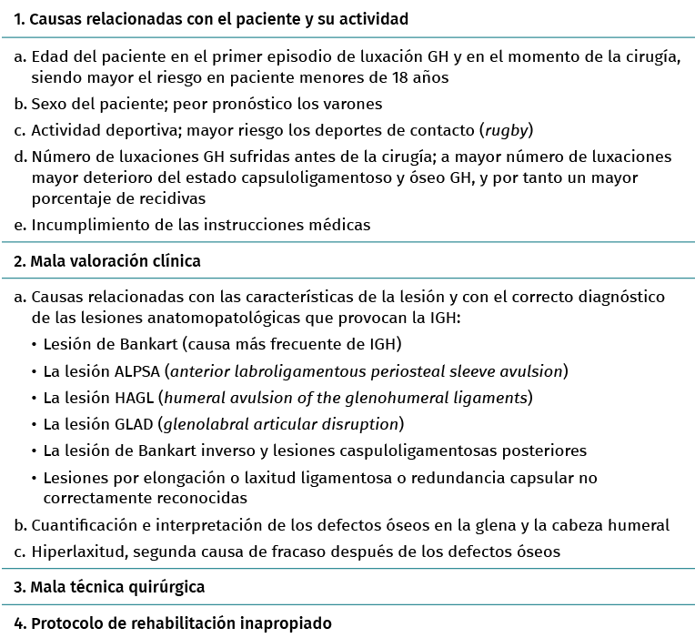 The shoulder is the joint with the highest dislocation rates and some published series have stated a high risk of recurrence after primary repair. The purpose of this article is to gather the subjects which were debated and consensed about during the Shoulder Arthroscopy Update Summit from the AEA-LATAM, regarding the causes of recurrence of glenohumeral instability following a primary repair, and the guidelines of action in each case. The analysis and debate of these subjects resulted in a consensus decalogue from all the attendees which is included in the conclusions section.