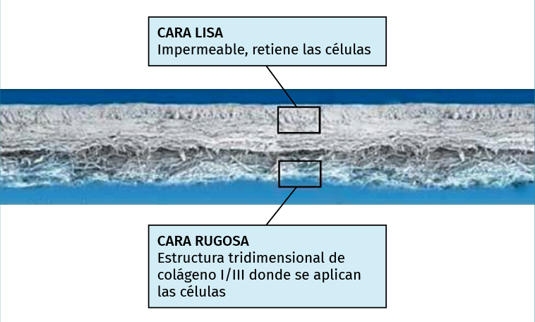 In 2008, the Clínica CEMTRO, together with Laboratorio Amplicel, started the development of a proprietary ACI method based on membranes for the treatment of cartilage lesions(31). This technique also uses the same biomaterial as in MACI, i.e., a type I/III collagen membrane of porcine origin. The membrane has a permeable rough surface where the cells are deposited, followed by placement in contact with the lesion, and a non-permeable smooth surface that prevents the cells from "escaping" from the membrane into the joint cavity (Figure 10).