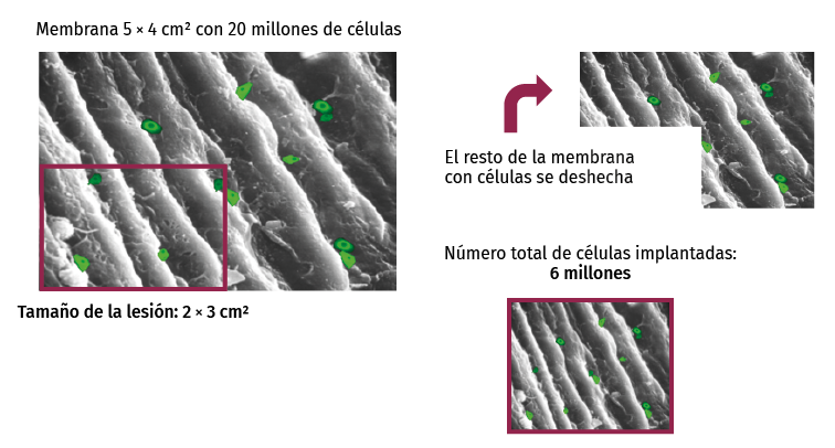 • During cell implantation, the membrane is trimmed according to the shape and size of the lesion, and the entire cell culture (at least 20 million cells) is seeded in the membrane.