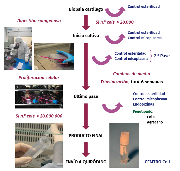 Figure 15 schematically presents the autologous chondrocyte culture process under GMP conditions. Good Manufacturing Practices (GMP) are known as Total Quality Management standards, and ensure that all the variables intervening in production are fully controlled - ensuring the quality of all the cultures produced.