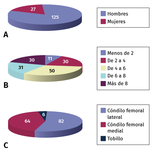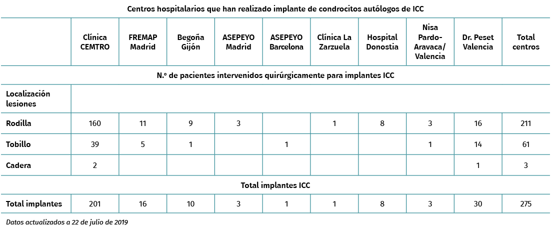 In the period between 2010 and 2018, a total of 245 patients underwent ICC in the Clínica CEMTRO and other hospitals (Table 3) for the treatment of chondral defects of the knee, ankle and hip.
