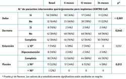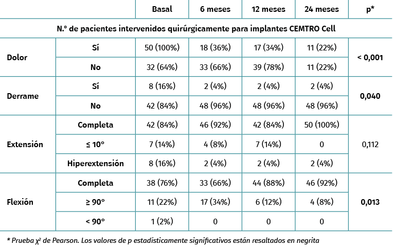 As can be seen in Table 3, both pain and effusion improved significantly over follow-up versus the patient baseline condition. With regard to mobility, flexion also improved significantly with respect to the baseline situation.