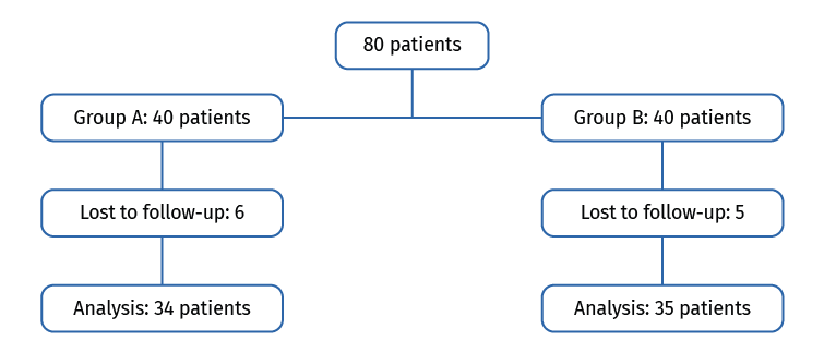 A sample size of 60 patients (30 subjects per group) was estimated in order to secure a statistical power of 95% in detecting a Cohen effect size of 1, assuming a standard deviation (SD) for both groups of 10 with an alpha value of 0.05 (two-tailed), and assuming a 10% patient loss rate. We decided to include 40 patients per group in order to compensate the possible negative impact of losses to follow-up.