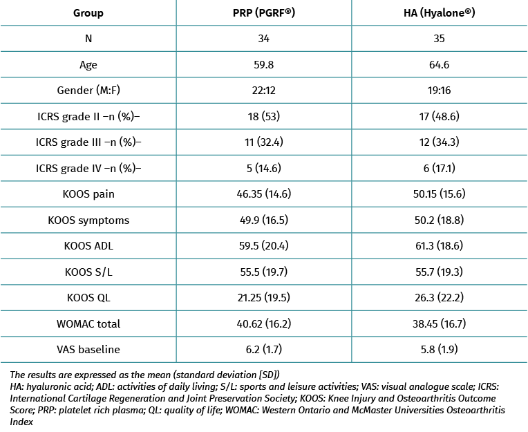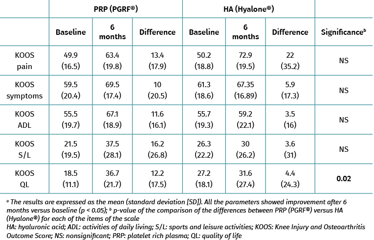 Table 2. Results of the KOOS score: PRP group (PRGF®) versus the HA group (Hyalone®)a.