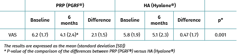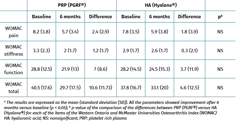 Table 3. Results of the WOMAC score: PRP group (PRGF®) versus the HA group (Hyalone®)a.