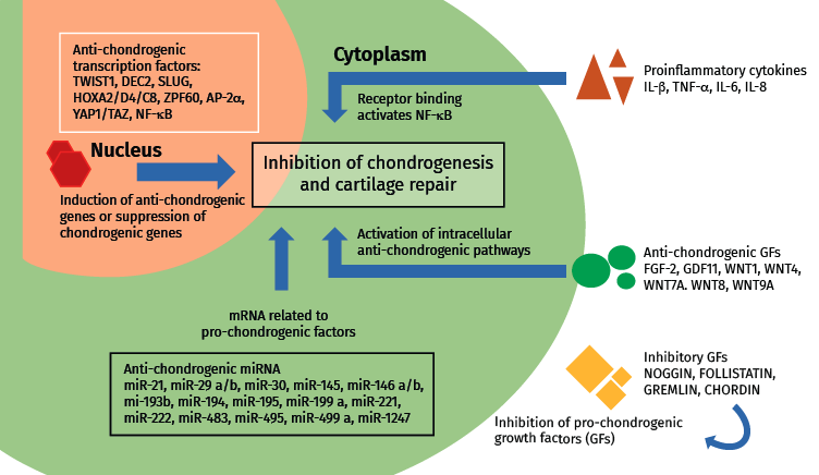 Figure 1. Anti-chondrogenic regulators in cartilage repair. The most important extra- and intracellular anti-chondrogenic regulators and their general mechanism of action. Modified from Lolli et al.(10).