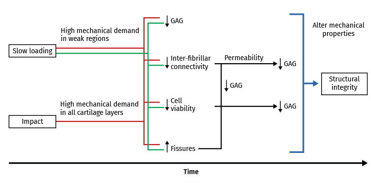 The reduction of fibril interconnectivity is the first sign observed after these forces, which weaken the tissue before the changes in cell viability and GAG losses in the superficial cartilage layers become apparent(104,110,111). The progressive increase in mechanical demands leads to cell death, collagen denaturalization and -eventually- the induction of surface fissures(112)(Figure 4).