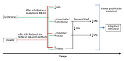 The reduction of fibril interconnectivity is the first sign observed after these forces, which weaken the tissue before the changes in cell viability and GAG losses in the superficial cartilage layers become apparent(104,110,111). The progressive increase in mechanical demands leads to cell death, collagen denaturalization and -eventually- the induction of surface fissures(112) (Figure 4).