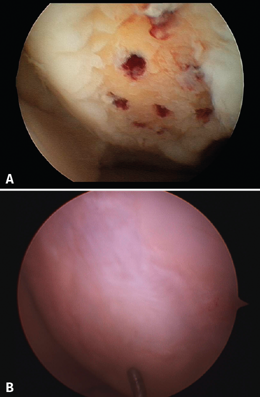 Figure 2. A: arthroscopic appearance of an ulcer with bleeding microfracture orifices; B: appearance of the same zone covered by fibrocartilage 8 months later.