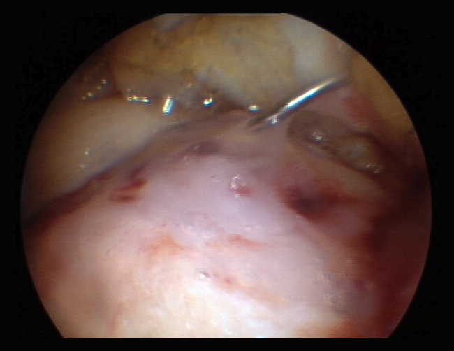 Figure 3. Arthroscopic filling of a femoral trochlear ulcer with CartiFill®.