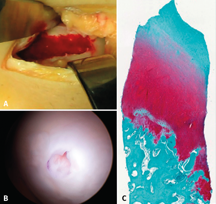 Figure 4. A: extensive chondral lesion of the internal condyle covered by the clot after augmented microfractures with chitosan based hydrogel; B: arthroscopic appearance of the totally covered zone and biopsy sampling orifice after 13 months; C: histological appearance of the biopsied zone. Note the "hyaline" appearance of the tissue and good interdigitation with the subchondral bone. Image of the randomized study with BST-CarGel.