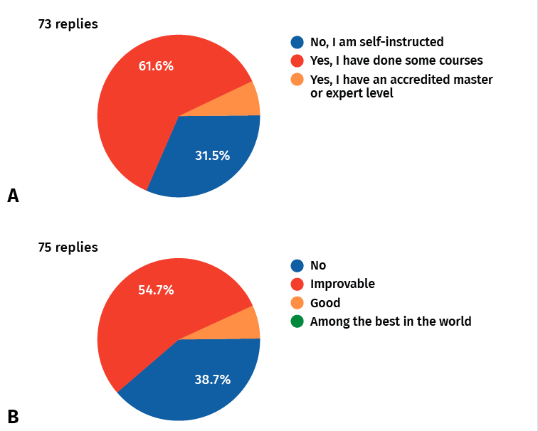 Figure 2. A: Do you have any accredited specific training?; B: Do you consider the level of musculoskeletal ultrasound practice among traumatologists in Spain to be good?