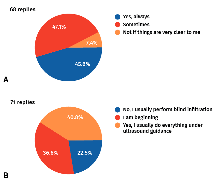 Figure 3. A: When indicating surgery, do you request any other imaging technique?; B: Do you have experience in ultrasound-guided treatments?
