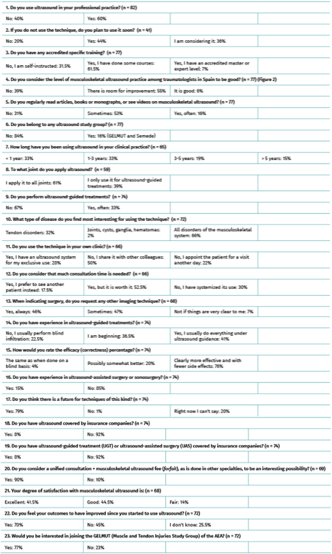 Sixty percent of the responders were already using Eco MSK in their daily practice - though 66% had been using the technique for less than three years. Forty-one percent performed "all" infiltration techniques under ultrasound guidance (UGT). Eighty percent considered the technique, and even the concept of UAS, to have a promising future. Eight-six percent of the responders expressed high satisfaction with Eco MSK. The main limitation of the study is the small number of responders (n= 82; only 7% of the members of the AEA). It would be interesting to conduct a similar survey involving a greater participation of traumatologists, with a view to comparing the results and analysing tendencies.