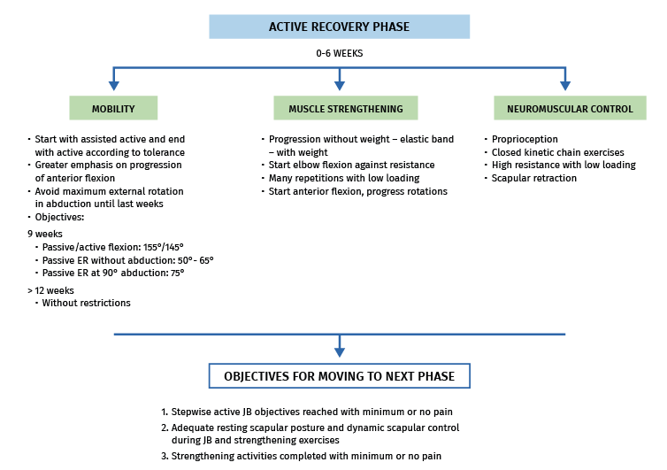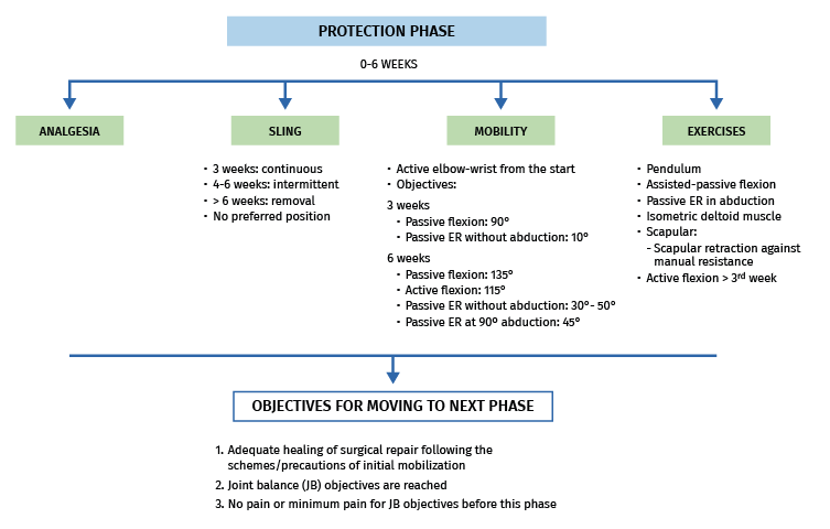 An interventional protocol divided into three chronological phases is described and developed: a first protection phase in which the main aim is pain control and protection of the repaired structures; a second active recovery phase seeking to restore active mobility and reinitiate basic activities of daily living; and a third functional recovery phase, with the resumption of physical exertion similar to that performed before the operation. It is important to underscore that there should be no strict timelines for these phases, since the duration of each period must be individualized according to the characteristics of each patient. Nevertheless, a series of concrete periods will be established in an attempt to define approximate time limits between each phase.