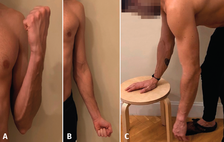 Figure 2. A: active elbow flexion exercise; B: active elbow extension exercise; C: Codman pendulum exercise.