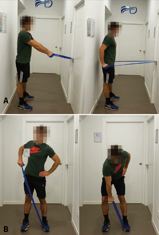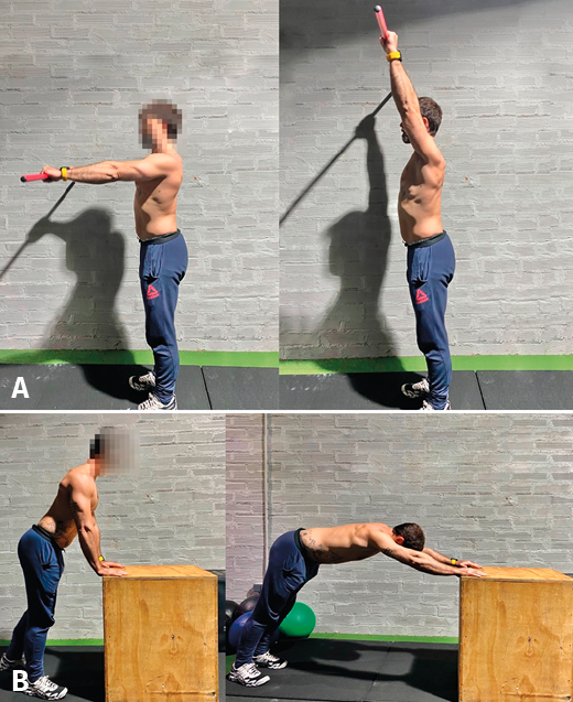 Figure 5. A: passive external rotation exercise with bar; B: scapular retraction exercise.