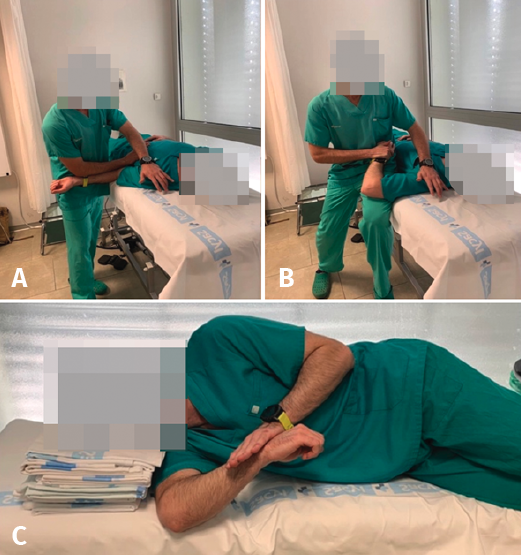 1. Codman pendulum exercise (Figure 2C), in which the patient bends forwards, flexing the trunk, and with the contralateral forearm resting on a table or chair, while the affected arm is swayed trying to minimize muscle activity around the glenohumeral joint. As the patient progresses, we can include weights of between 1.5-2.5 kg, likewise without muscle activation.
