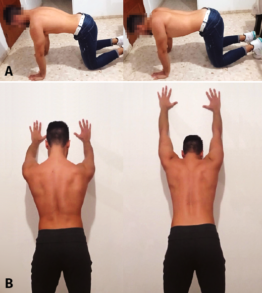 Figure 7. A: anterior serratus exercise on all fours; B: anterior serratus exercise in standing position.