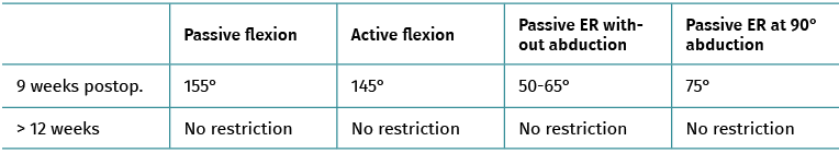 In 2010, the American Society of Shoulder and Elbow Therapists developed a consensus document specifying a series of stepwise increase in motion objectives during the postoperative period of anterior Bankart repair surgery (Figure 1) as a guide for patients and therapists(13). Stepwise increase in motion objectives have been shown to be very useful for achieving adequate progression of motion, thanks to the stimulus which the defining of a time limit represents for the patient(7). These objectives in turn can be modified according to the characteristics of each individual and the preferences of the surgeon. If the objectives are not reached within the established time period, gentle passive mobilization by physiotherapists is indicated. In contrast, if the objectives are reached too quickly, the established safety limits should not be exceeded, in order not to tension the repaired structures more than necessary, taking into account that anterior flexion exposes the lower part of the joint capsule to tension, in the same way that ER tensions the anterior capsular tissues while internal rotation (IR) tensions the posterior capsular tissues.