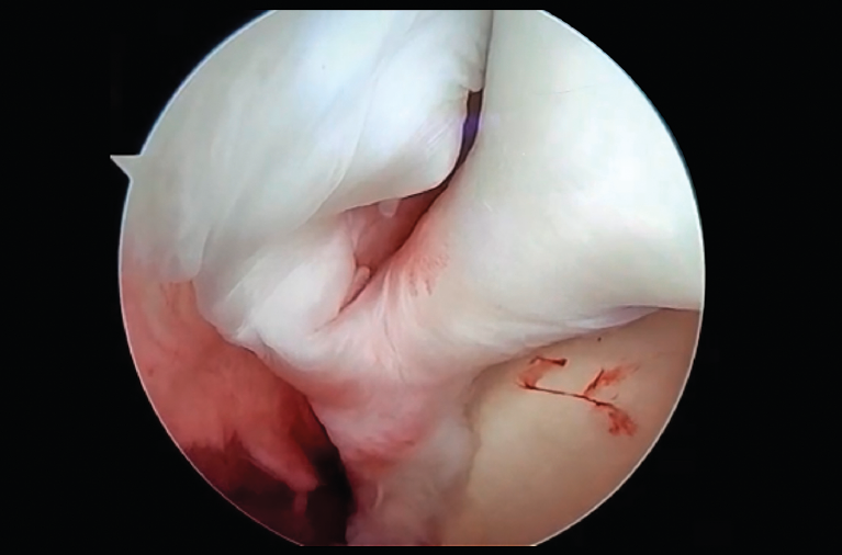 Image obtained from the lateral port, through complete supraspinatus rupture. We observe a MESO sb (small band) variant, identifying cord- or band-like tissue running from the main origin of the long portion of the biceps (LPB), in the upper labrum, to contact with the supraspinatus or superior capsule.