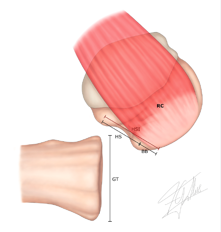 Figure 3. Measurement of the Hill-Sachs interval (HSI): this is the result of measuring the Hill-Sachs width (HS) plus the bone bridge (BB) between the medial margin of the insertion of the cuff and the lateral region of the Hill-Sachs lesion: HSI = HS + BB. RC: insertion of the rotator cuff.