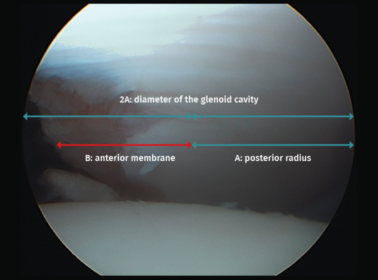 Figure 4. View of the glenoid cavity from the anterosuperior port. Arthroscopic measurement of the glenoid bone defect. Posterior radius: A (mm). Diameter of the glenoid cavity = 2A. Anterior measurement: B (mm). Defect: A − B = d mm (bone loss). Percentage defect: d / 2A = D%.