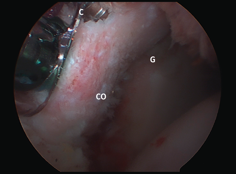 Figure 5. Latarjet procedure, arthroscopic technique. View of arthroscopic coracoid (CO) fixation from the J portal. C: guide cannula for placing the screws; G: anteroinferior part of the glenoid cavity.