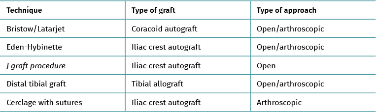 Table 1. Some glenoid bone providing techniques for bone defects in anterior instability