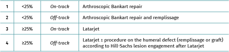 Patients with a glenoid cavity defect of <25% and a Hill-Sachs lesion of >30% (or off-track) can be treated through soft tissue repair (Bankart repair), adding the remplissage technique.