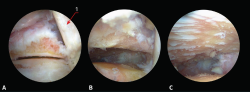 Joint cleaning was made with curved curettes and abrasion synoviotomes (Figure 4C), avoiding the creation of large spaces and using the portal exchange manoeuvre.