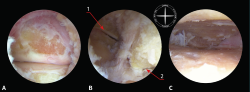 We completed joint debridement and denudation of the cartilage with curettes, scoops and abrasion synoviotomes (Figure 2C), avoiding the creation of large spaces and using the portal exchange manoeuvre.