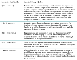 Although different rehabilitation programs are available, there are key elements that should establish the basis of any protocol. These elements include initial limitation of weight bearing, the prevention of posterior tibial subluxation, and early strengthening of the quadriceps muscle. With regard to loading, the described protocols are highly variable, with a minimum period of avoidance of weight bearing of between 3-6 months, since it has been demonstrated that PCL graft healing takes almost twice as long as ACL graft healing(32,33). In the immediate postoperative period, simple immobilization in extension is required during the first 72 hours to avoid high pressures in edematous zones of the operated knee. After this period we can switch to a dynamic knee pad specific for the PCL that continuously maintains a certain anterior drawer through the application of sustained pressure in the posterior zone of the tibia. It is advisable to wear these knee pads 24 hours a day for at least 2-3 months. Some rehabilitation protocols even extend this period to 6 months after surgery(32,33). A progressive postoperative rehabilitation program is indicated, with clear objectives and divided into 5 phases, that has been shown to be the best strategy for securing improved stabilization of posterior tibial translation, varus and external rotation (Table 3)(4).