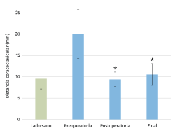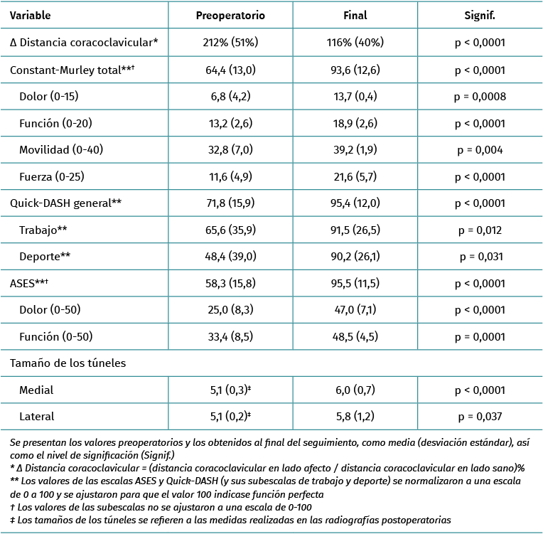 At the end of follow-up, significant improvement was observed in all three functional assessment scales and their sub-sections (Table 2 and Figure 2). Thirteen patients (93%) presented distal clavicular stability in both planes at exploration, with no noticeable scapulothoracic dyskinesia. The good reduction achieved in the immediate postoperative period in 12 of the 14 patients persisted at the end of follow-up, though the degree of displacement in the two subjects with insufficient correction in the postoperative period was seen to progress (with increments of 74% and 132%, respectively). In addition, we documented osteolysis of the distal clavicle and mild degenerative changes in the acromioclavicular joint in 5 cases. With regard to the size of the clavicular tunnels, an increase in diameter was noted, though the increase was only > 2 mm in three tunnels corresponding to three different individuals.