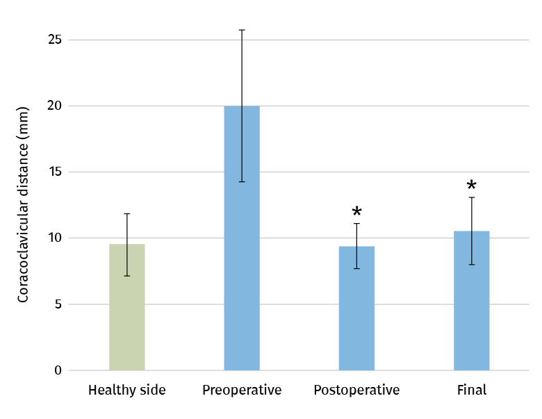 Figure 1. Coracoclavicular distance measured from the anteroposterior radiograph of the shoulder. The data correspond to the affected side (preoperative) and the healthy side as reference. The described technique allowed recovery of normal coracoclavicular distance after surgery (postoperative) and at the end of follow-up (final). * Significant differences (p < 0.0001) with respect to the preoperative values. There were no significant differences among the postoperative, final and healthy side values.