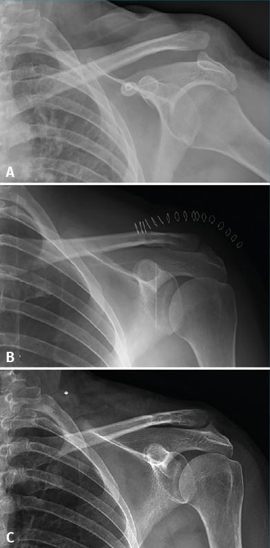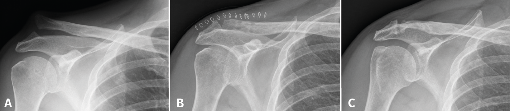 Figure 3. A 52-year-old woman with type IV acromioclavicular dislocation (A) subjected to surgery four weeks after injury due to refractory pain and dysfunction. The surgical outcome was considered acceptable, though with insufficient reduction (B). Fourteen months after surgery, the patient suffered persistent symptoms and loss of reduction was seen to have progressed (C).