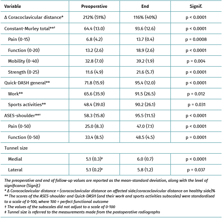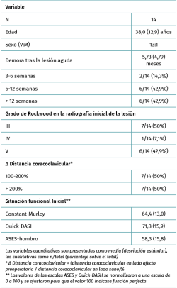 The postoperative radiographic control evidenced correct reduction of the joint, with a restored coracoclavicular distance in 12 patients (85.7%); two subjects presented insufficient reduction but which was considered acceptable (43% and 54% increase in coracoclavicular distance).
